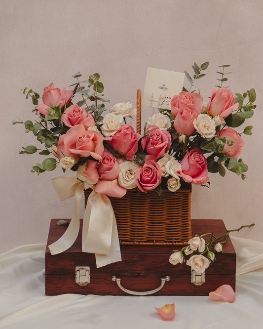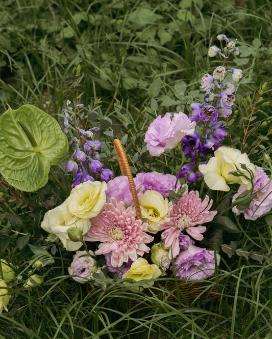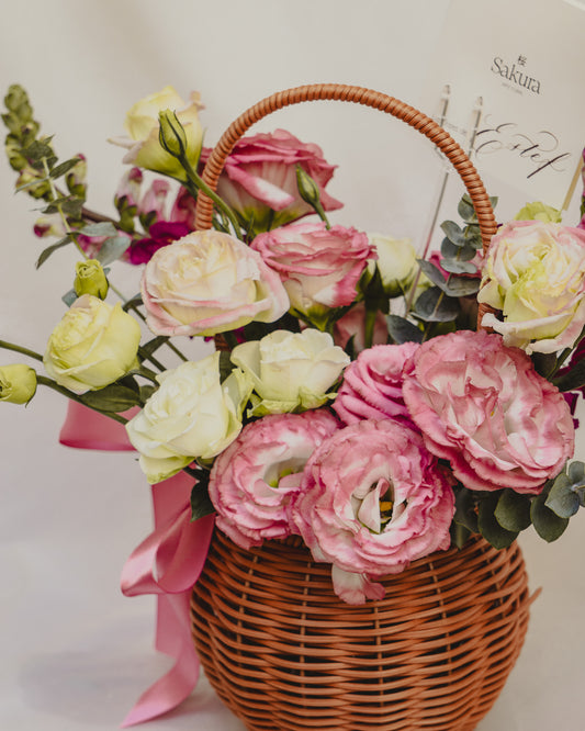 Momo Basket, arreglo floral en canasta con lisianthus rosa