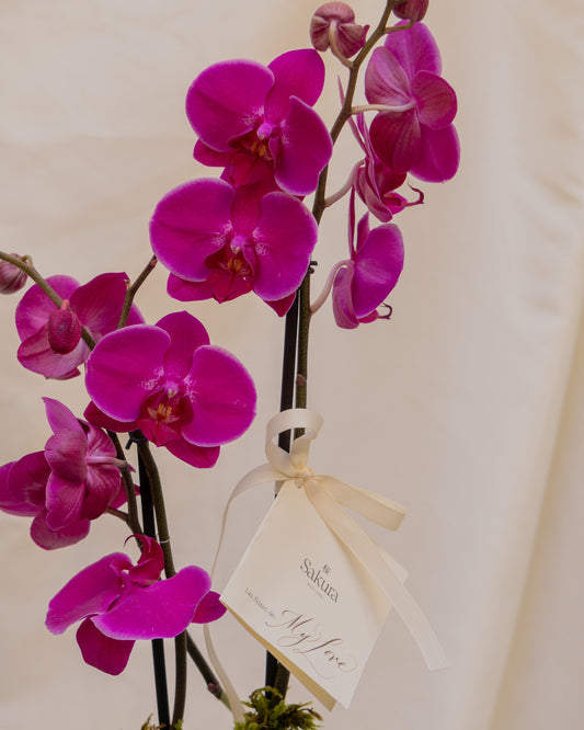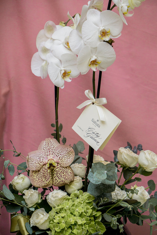 Nicky, arreglo floral de orquídea en planta con rosas y hortensia